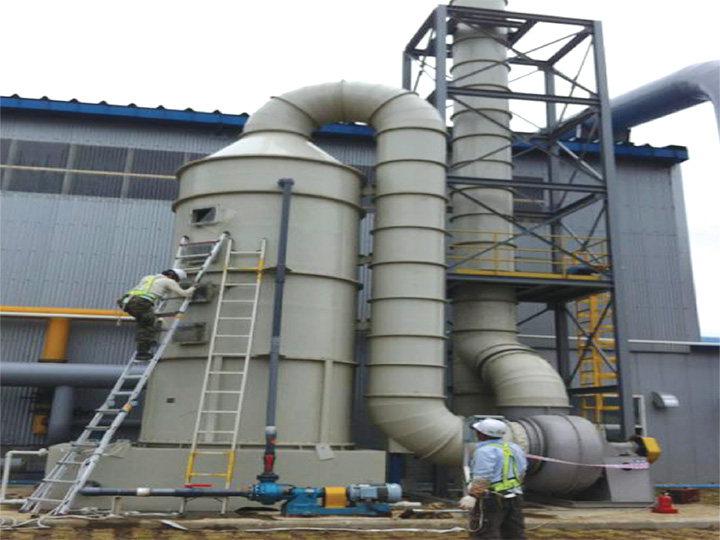 旋流板塔氣體凈化器的主體結構為旋流板,為噴射型塔板,是氣液傳質裝置,特點是氣液負荷高,降壓低,操作彈性寬和不易堵等綜合性能。氣流通過葉片時產生旋轉運動,吸收液噴射在踏板中間的盲板上,并濺向周圍葉片而形成薄液層,被旋轉向上的氣流形成劇烈攪動而成為細小液滴,由于氣通塔板葉片時旋轉而產生的離心力將液滴甩向塔壁,液體一因重力作用集流至溢流口,通過溢流裝置流到下一塊旋流板的盲板區。連續對有廢氣進行多級吸收反應,能完成中和吸收機理。設計人員可根據廢氣的種類、性質、濃度決定級數,選用不同的吸收液。